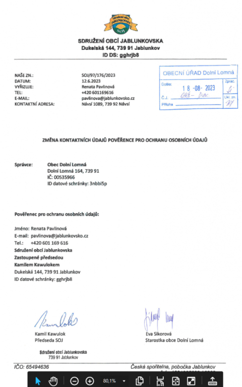 - Zpracování Vašich osobních údajů je vždy podloženo právním základem. Vaše osobní údaje zpracováváme pouze na základě právní povinnosti – ukládá nám to některý ze zákonů České republiky, nebo je zpracování nezbytné pro splnění úkolu prováděného ve veřejném zájmu nebo při výkonu veřejné moci, kterým jsem pověřeni – obce jsou orgány veřejné moci; zpracování je nezbytné pro splnění smlouvy, jejíž smluvní stranou je subjekt údajů; zpracování je nezbytné pro účely našich oprávněných zájmů či třetí strany, kromě případů, kdy před těmito zájmy mají přednost zájmy nebo základní práva a svobody subjektu údajů anebo tehdy, pokud nám k tomu udělíte souhlas – souhlas je vyžadován jenom tam, kde nelze osobní údaje zpracovávat na základě předchozích titulů. Při tomto zpracování nedochází k automatizovanému rozhodování ve smyslu článku 22 obecního nařízení GDPR.